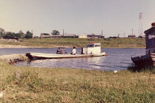 昭和30年代頃の長門石側からの渡し舟です。向こう側に梅林寺の